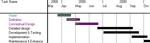We can get an impression from this chart that the project is a little behind schedule. It is not easy to see exactly how far behind, how much effort is required to catch up, or what the implications are - but clearly there is a need for management attention.